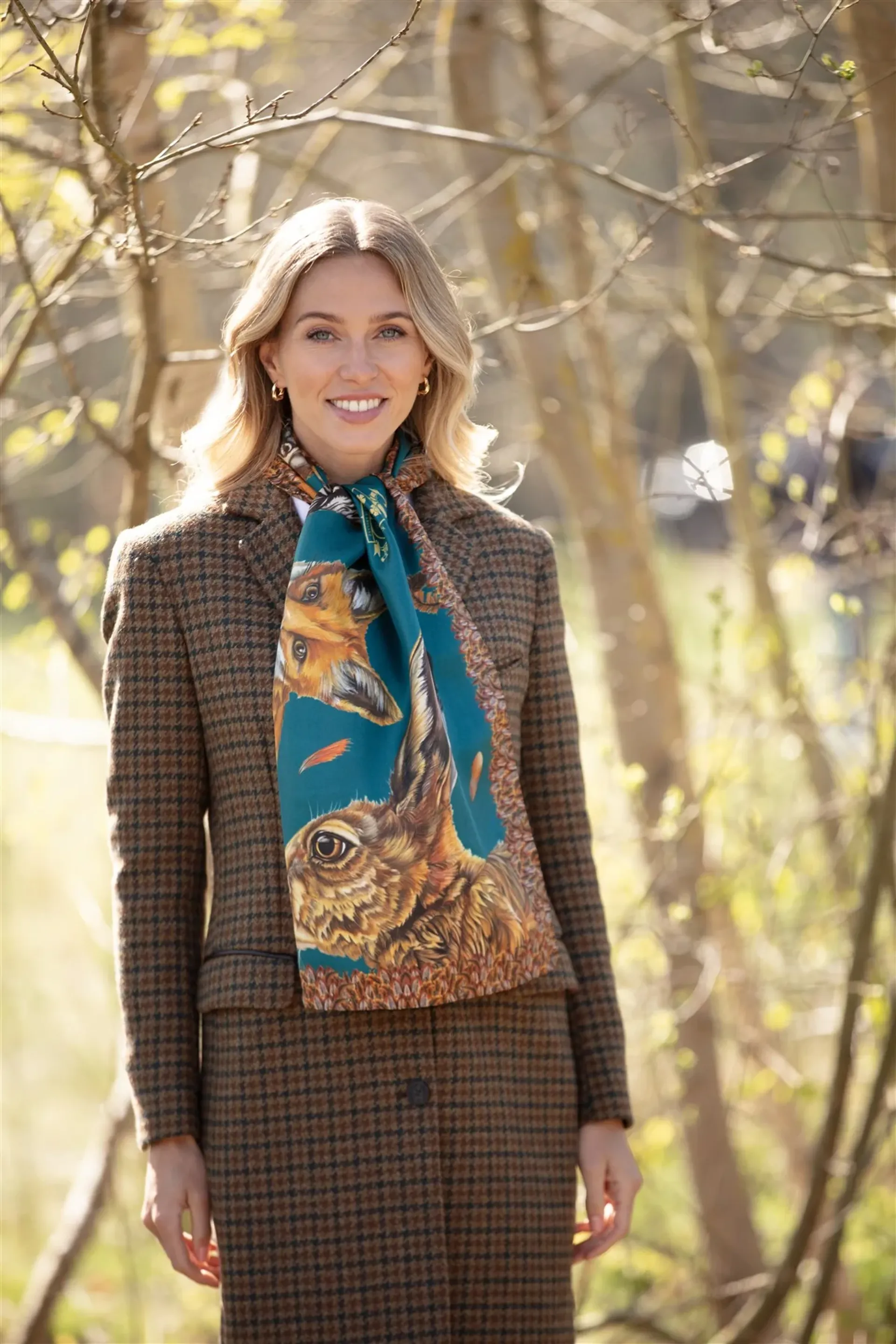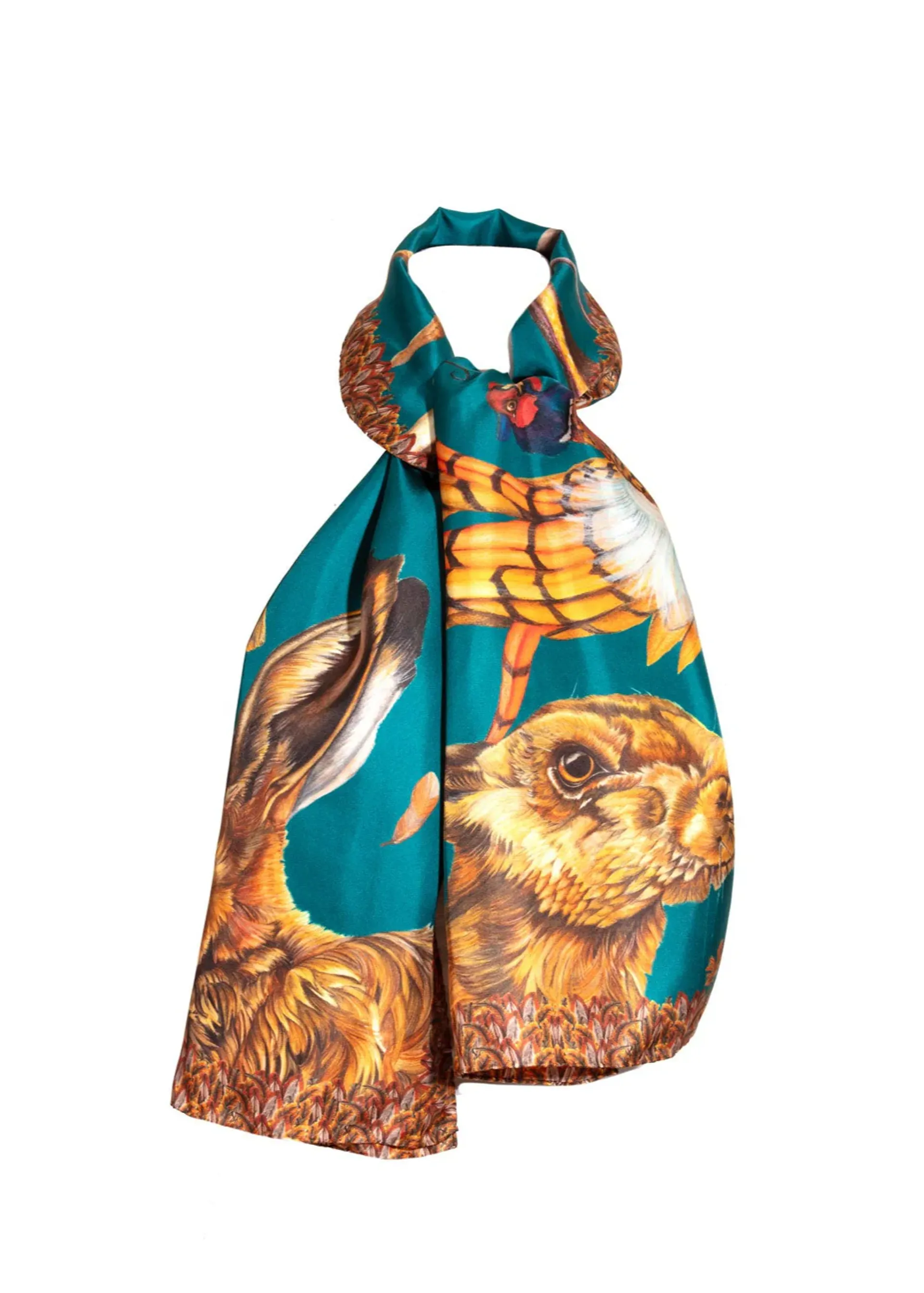 Pheasants, grey and French partridges, the majestic stag (“Caledonia”), hare, snipe, and feather accents all intermingle in this joyous collection. With a striking Teal colourway now available in the luxurious Classic Pure Silk Scarf, there's no better way to wrap yourself in Autumnal hues.
