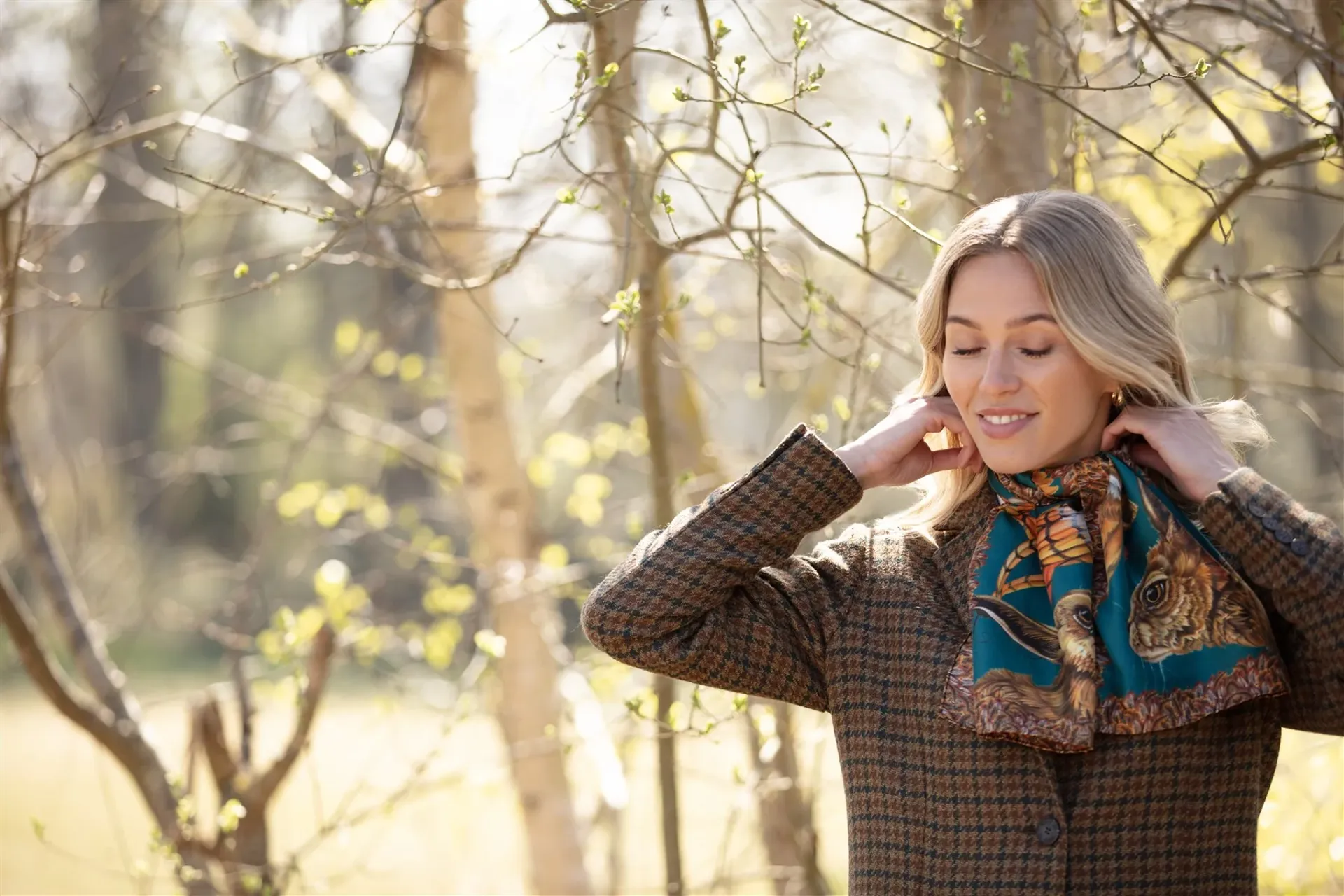 Pheasants, grey and French partridges, the majestic stag (“Caledonia”), hare, snipe, and feather accents all intermingle in this joyous collection. With a striking Teal colourway now available in Narrow Pure Silk Scarf, there's no better way to wrap yourself in Autumnal hues.