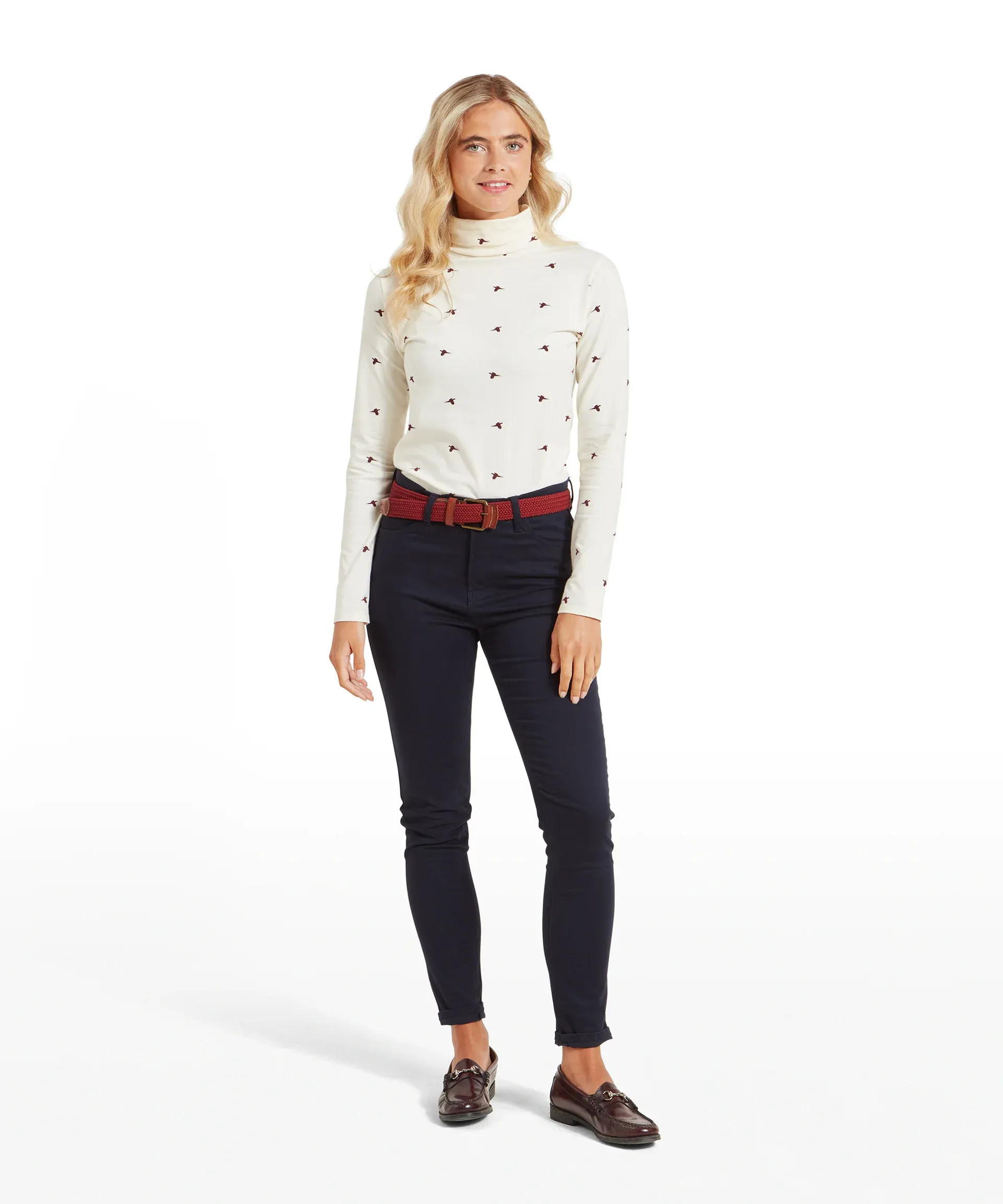 The slim-fitting women's Malham top from Schoffel, brings together a soft stretch-jersey fabric, a roll neck, and a charming silhouette country print in an easy-to-wear layer.